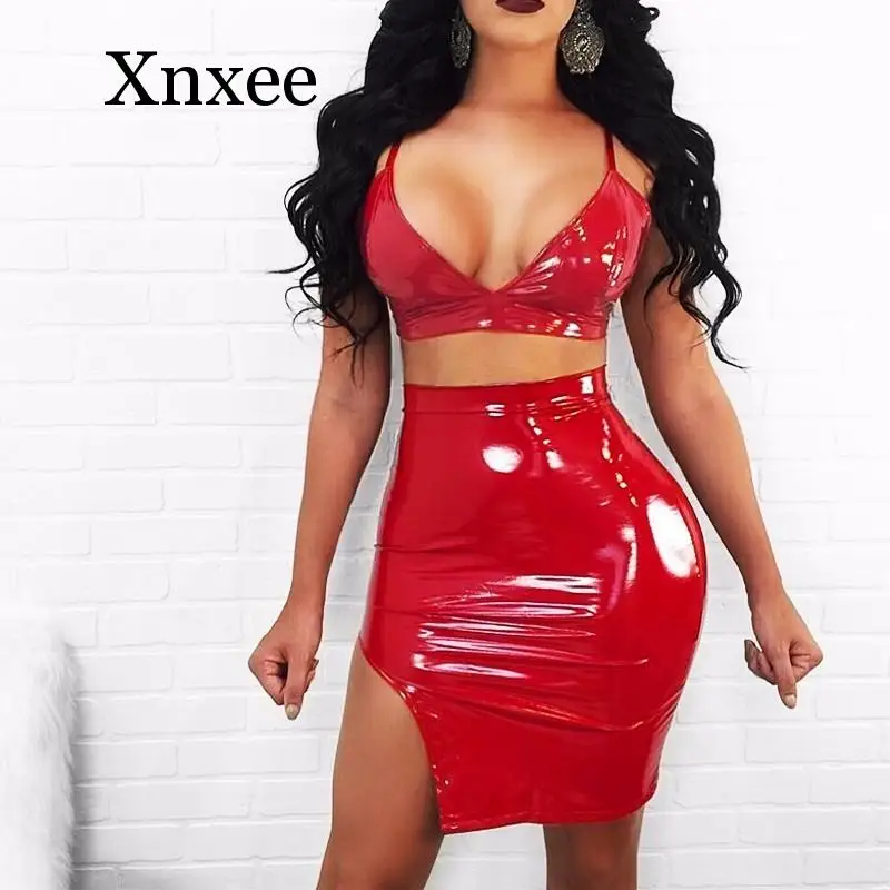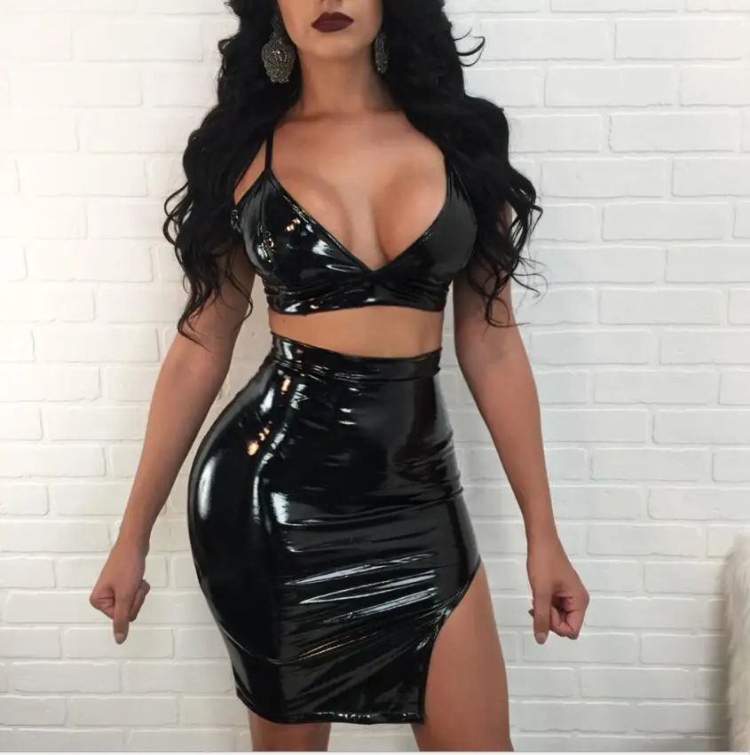 Images of Seduction bar party PU Leather Two Piece Set Crop Top Spaghetti Strap And Split Mini Skirt Sexy 2 Piece Set Women Summer Outfit :