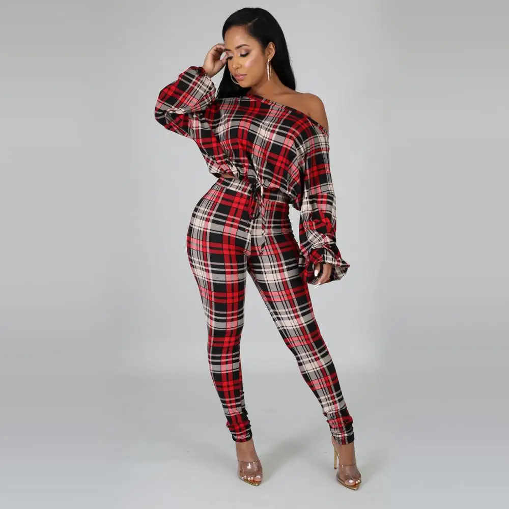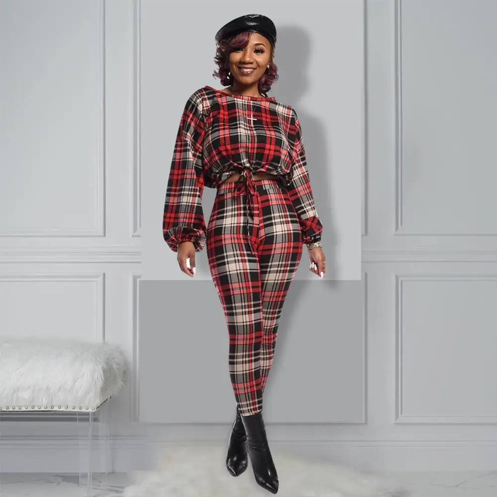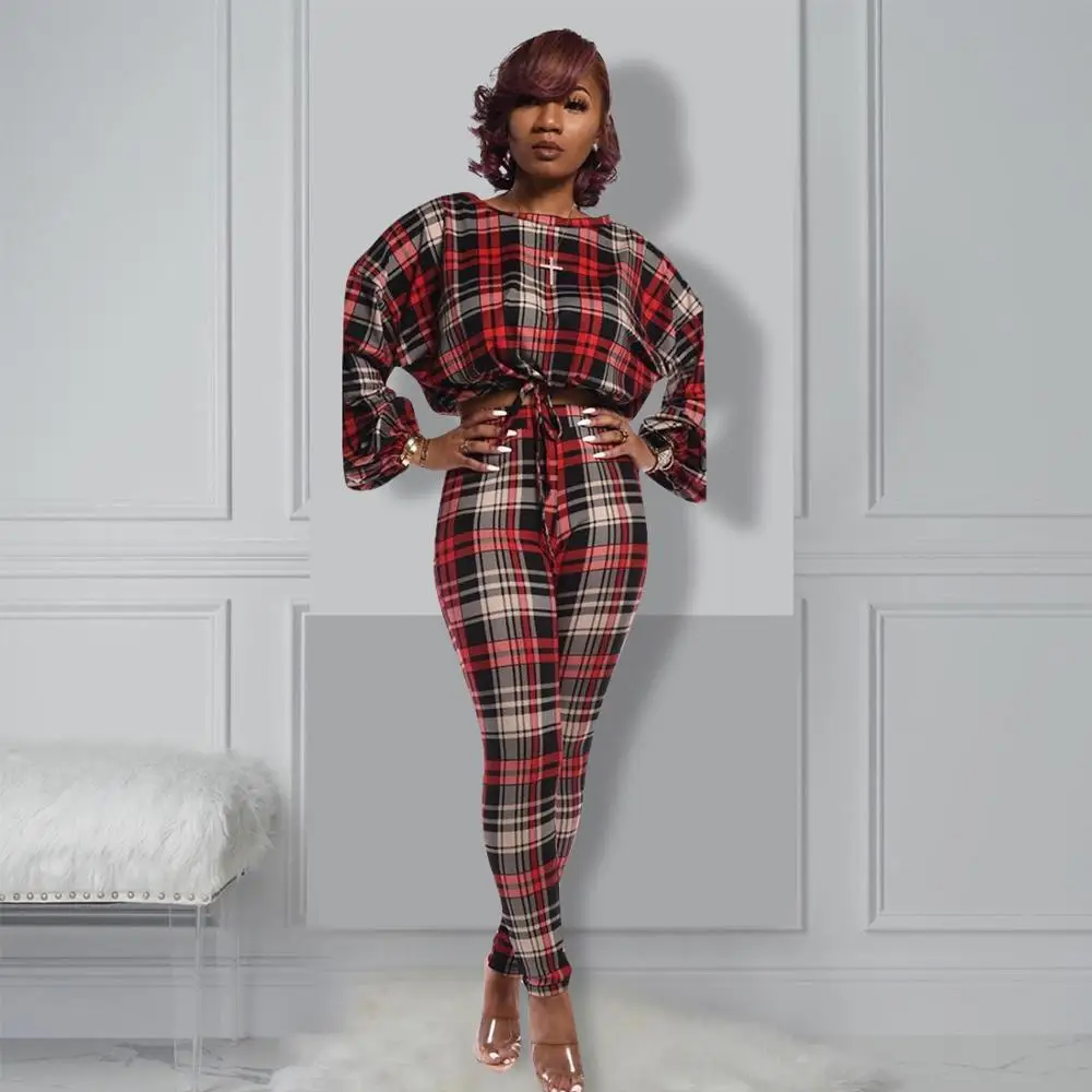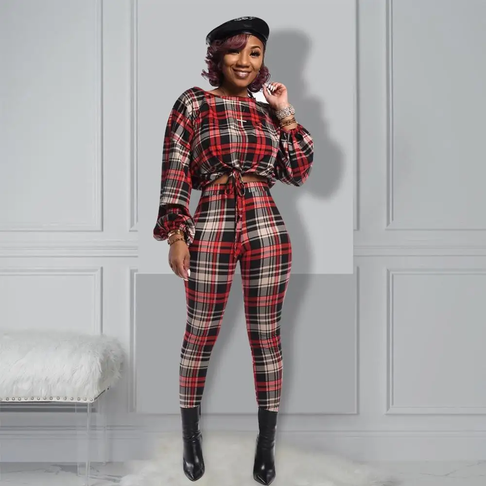 Images of Spring New Red Plaid Fashion Matching Sets Plus Size 2020 Clothes Woman Two Piece Pants Set Sexy Holiday Outfits :
