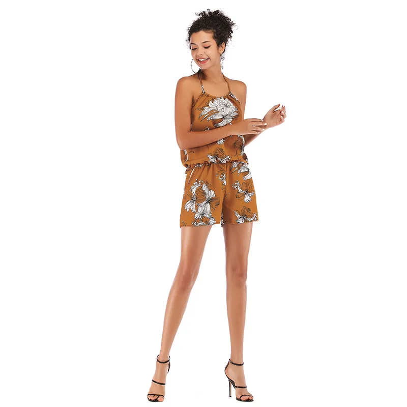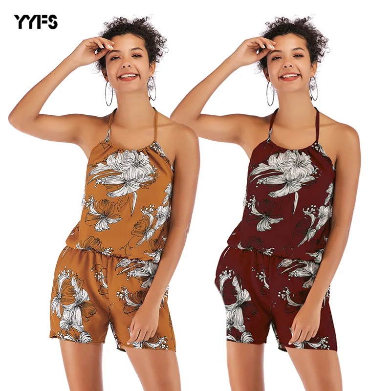 Best Offer Summer Two-piece Women's Sleeveless Floral Shorts Sling Backless Loose Print Chiffon Jumpsuit