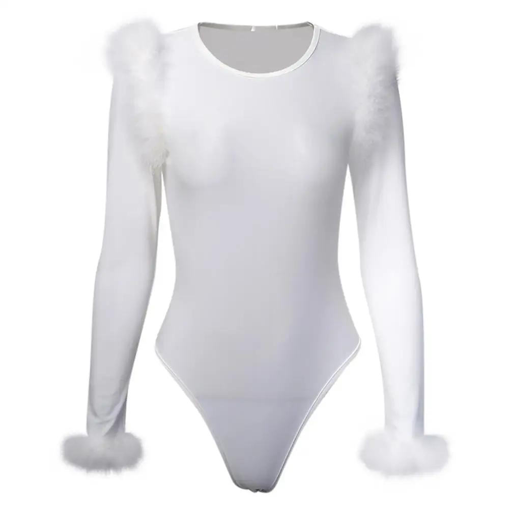 Images of Feather Splice Women Jumpsuits Sexy O-Neck Long Sleeve Furry Slim Solid Leotard Bottoming monos de fiesta 2020 Drop Shipping E :