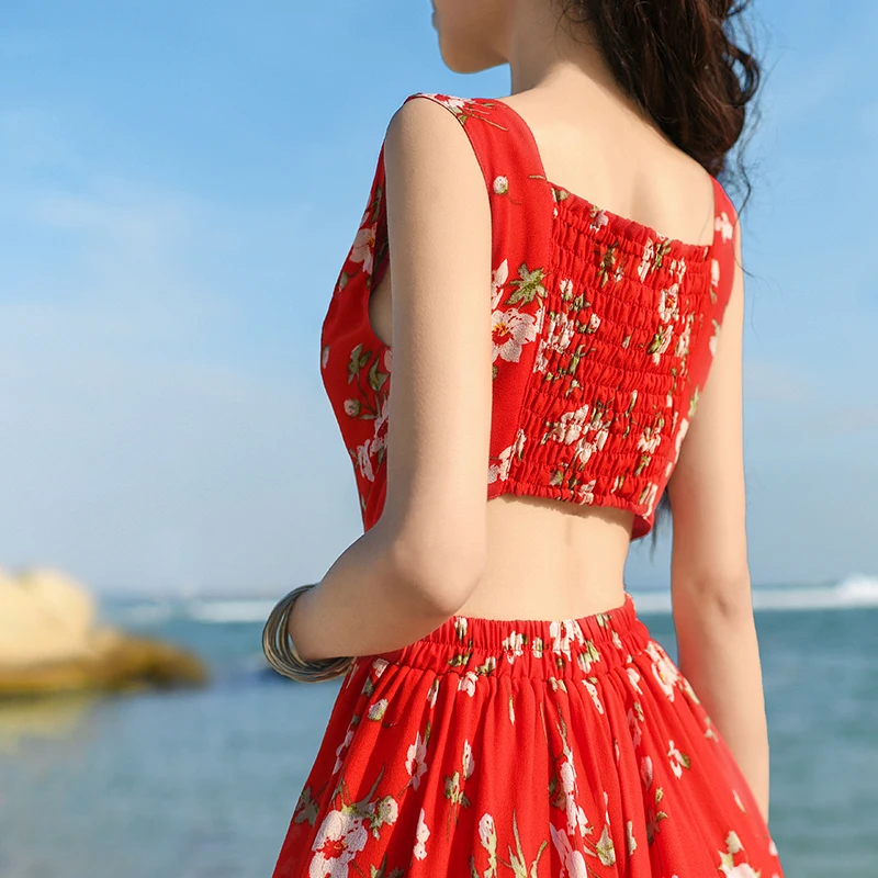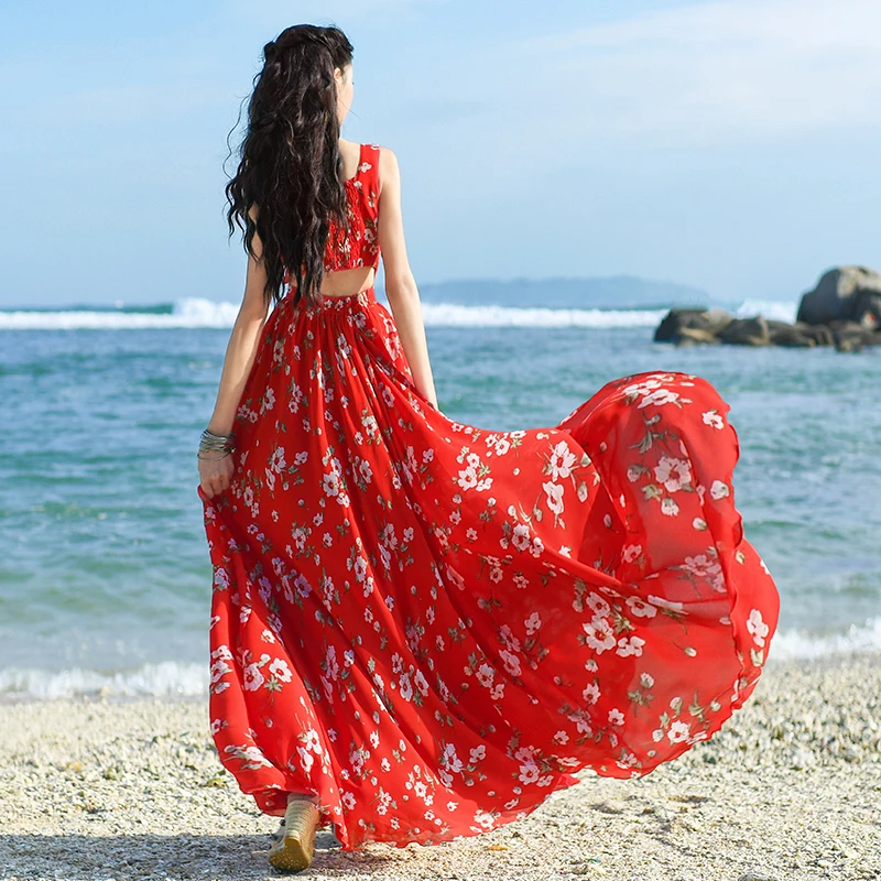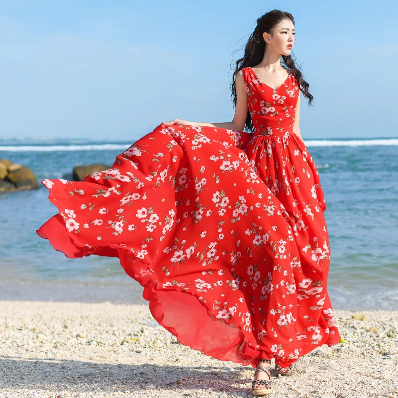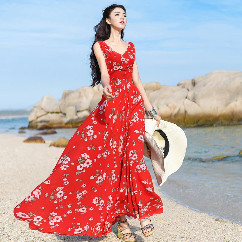 Images of Free Shipping Boshow 2017 New Fashion Summer Women Flower Print Chiffon Red One-piece Long Maxi V-neck High Waist Dresses S-XL :